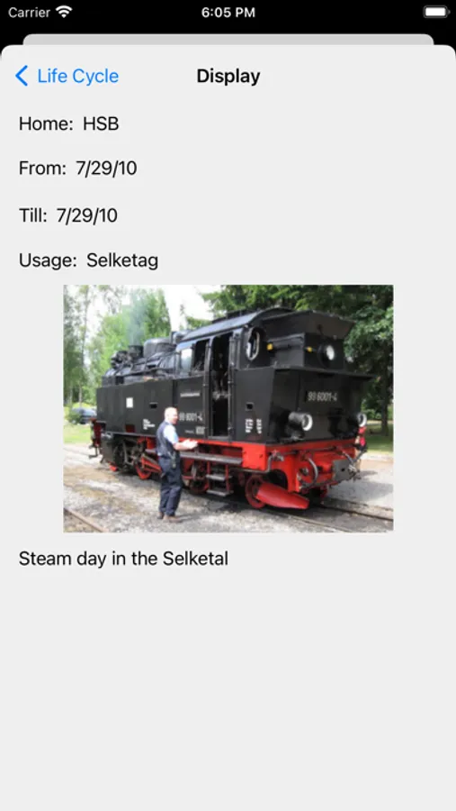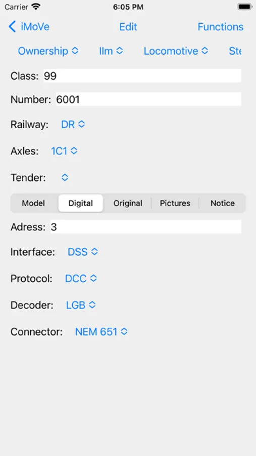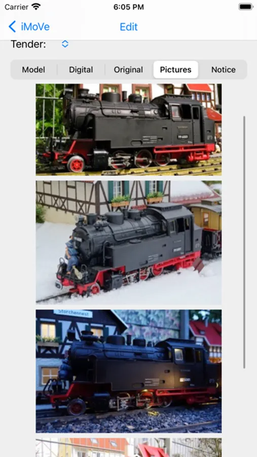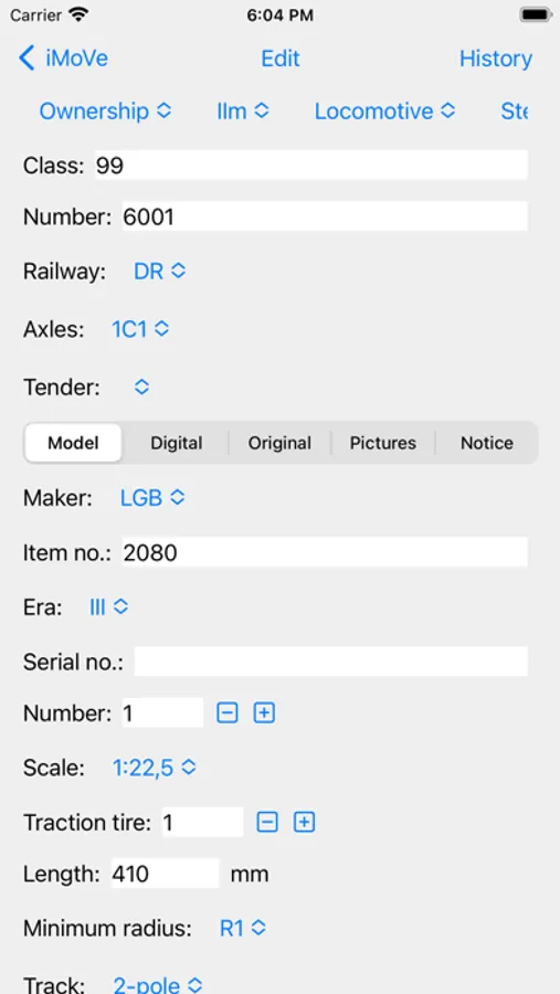 This app gives you a good overview of your model train collection. You can store all values (gauge, class…) of your models in this app. But not only the information of the model can be stores. Also the dates of the original can be administered.