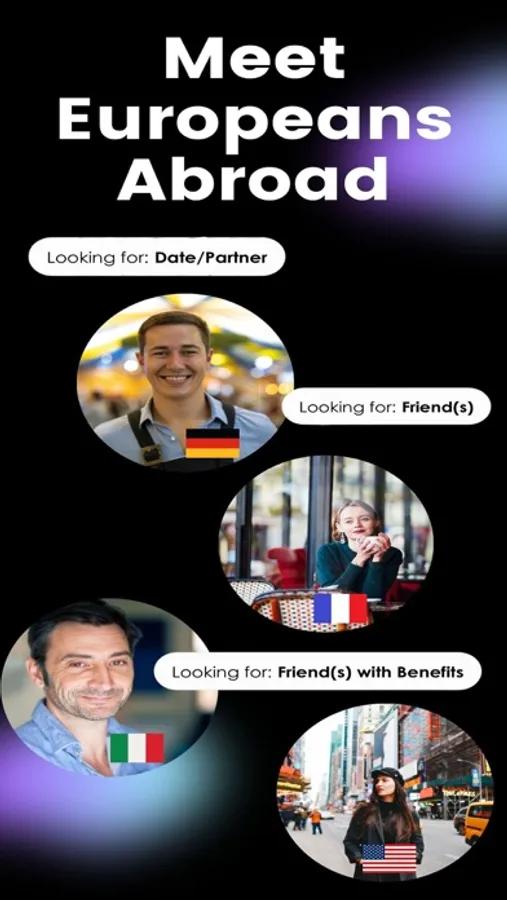 Find friends, dates, partners that share your love for Europe and its people and culture - no matter where you are and who you are. Straight, gay, bisexual, non-binary, or anything between. Europeans Abroad helps you find what’s right for you.