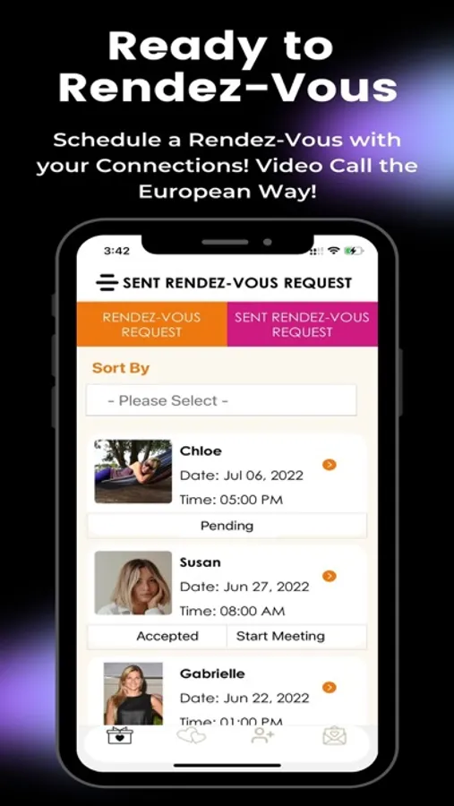 -You decide if you want to connect with somebody. Once you made a connection, start messaging each other on the in-app messaging platform and schedule a Rendez-Vous (in-app video call).