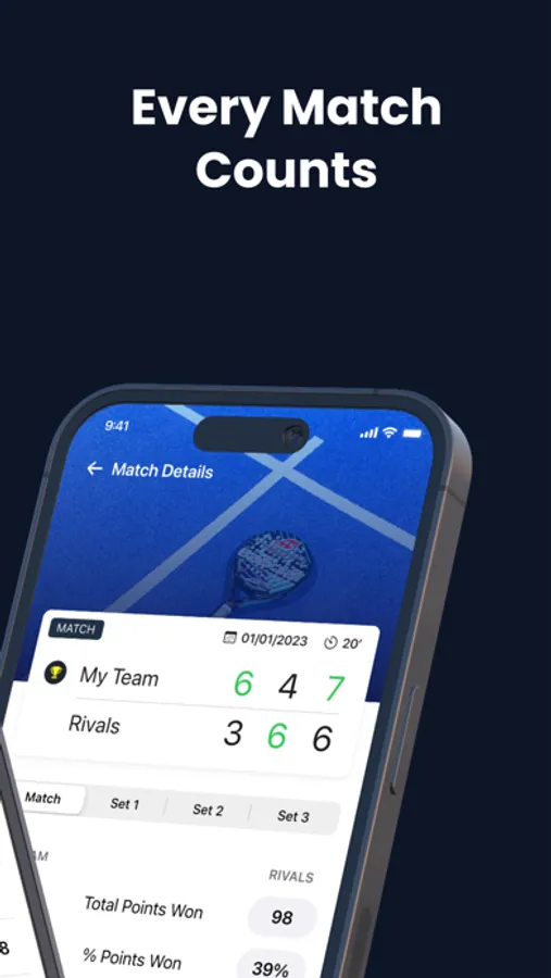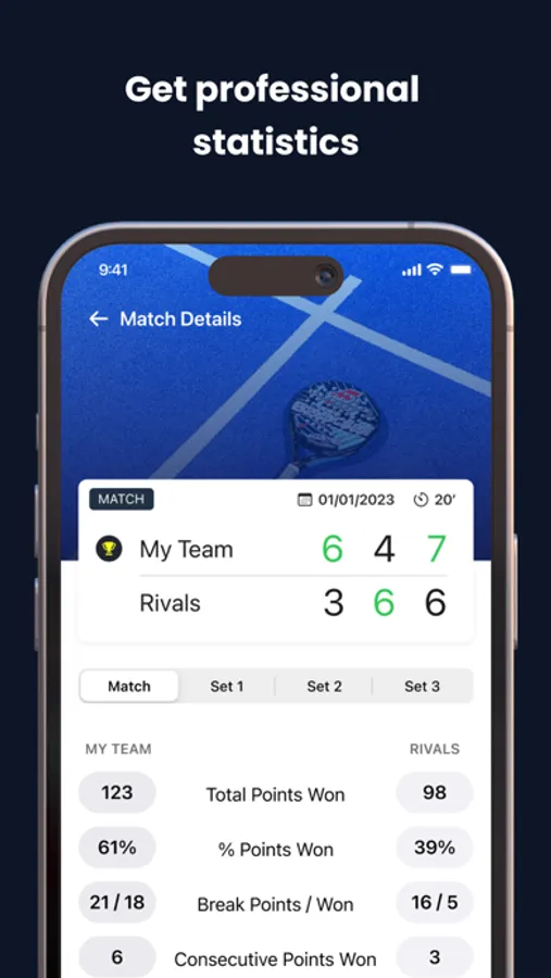 • Professional stats: Check the matches on your iPhone and discover in detail the professional stats of your matches. You will be able to visualize the performance of both teams set by set, and have an overview of your progress. Discover metrics such as the longest consecutive point streak, the number of break points each team has converted, percentage of points won and much more.