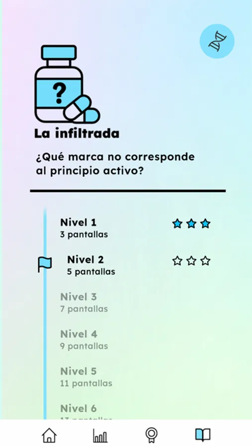Aprende a relacionar los principios activos con las marcas comerciales que se dispensan a diario en las farmacias. Formarte con La Infiltrada es fácil, ameno y divertido. Podrás retarte a ti mismo y compararte con otros farmacéuticos a través del ranking, consiguiendo la mejor puntuación y logrando diferentes recompensas que te permitirán mantener la mayor motivación.