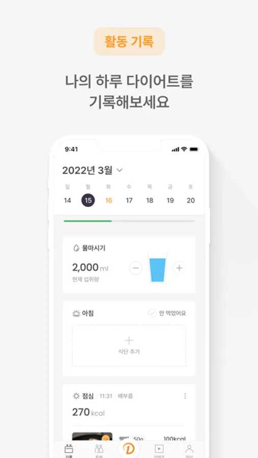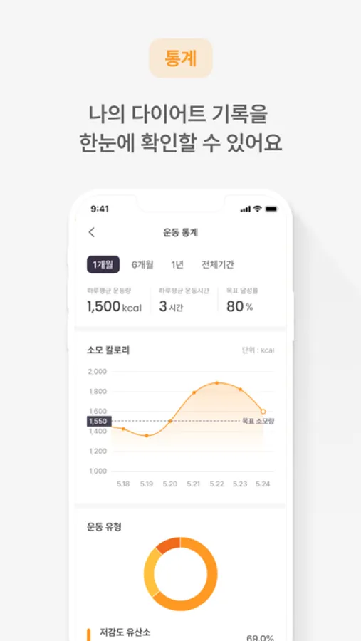 꾸준하게 기록하는 것 만으로도 70% 이상 건강한 식습관, 운동습관, 생활습관 형성으로 하루하루 다이어트 목표에 다가갈 수 있어요.