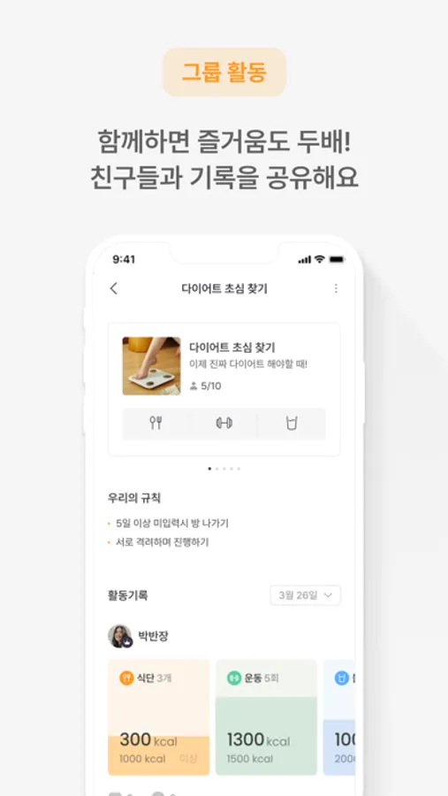 그룹에서 멤버들끼리 서로의 건강한 식습관, 운동습관, 생활습관 하루 다이어트를 위해 응원해주며 더 재밌게 지속해보아요.