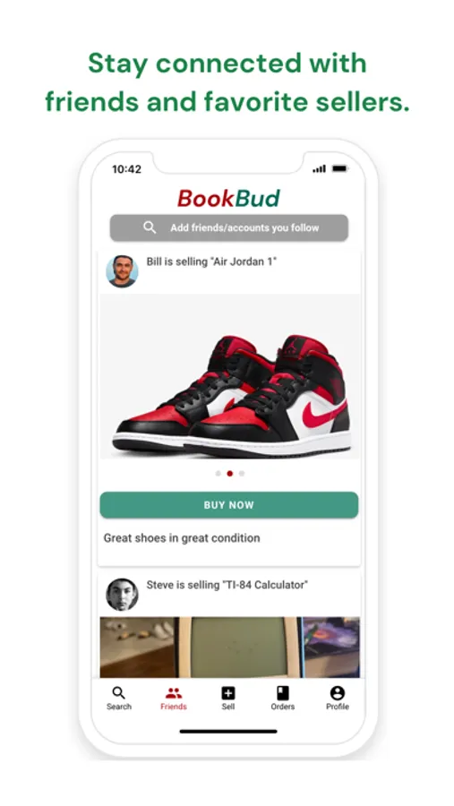 To buy a product, search with BookBud Search or scroll through the Home Feed or Friends Feed, tap Buy Now, and pay with PayPal. Once you pay, you'll see a screen with the seller's contact info and buttons to text, email, or call the merchant. Reach out to the seller immediately to coordinate fulfillment.