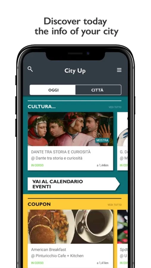 Inside you can find EVENTS, PROMO, COUPON and everything you need to know about your city, from public-institutional-cultural life, to everyday life: clubs, museums, monuments, live music, services, mobility, restaurants, shopping, where to sleep, cinema and theatres and much more. A MULTILINGUAL app designed for both citizens and tourists.