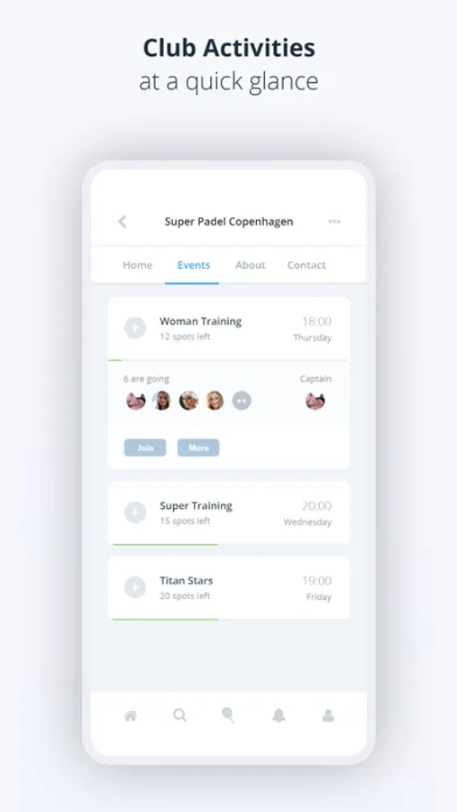 • Easy sign up for trainings, matches and other events