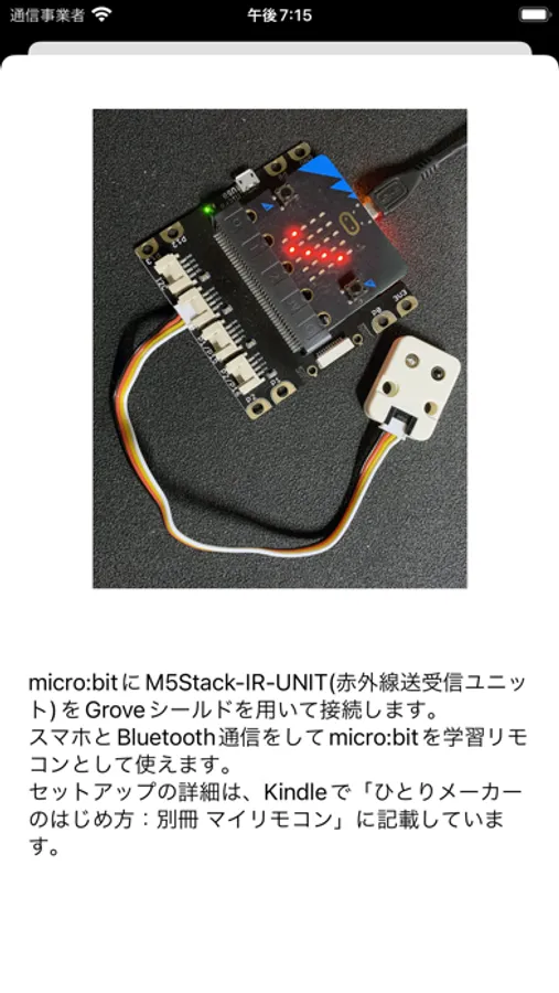 micro:bitにM5Stack IR-UNIT(赤外線送受信ユニット)をつないで、GitHubに置いてあるプログラムを書き込むことで、スマホからBluetooth通信でコントロールできる学習リモコンを実現できます。