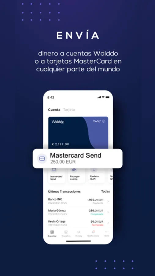 · Enviar dinero desde Walddo a cualquier tarjeta Mastercard en el mundo.