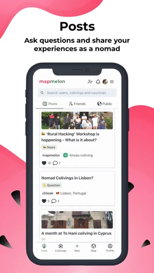 Keep track of your friends' plans, discover colivings, ask questions, and share your experiences as a nomad!