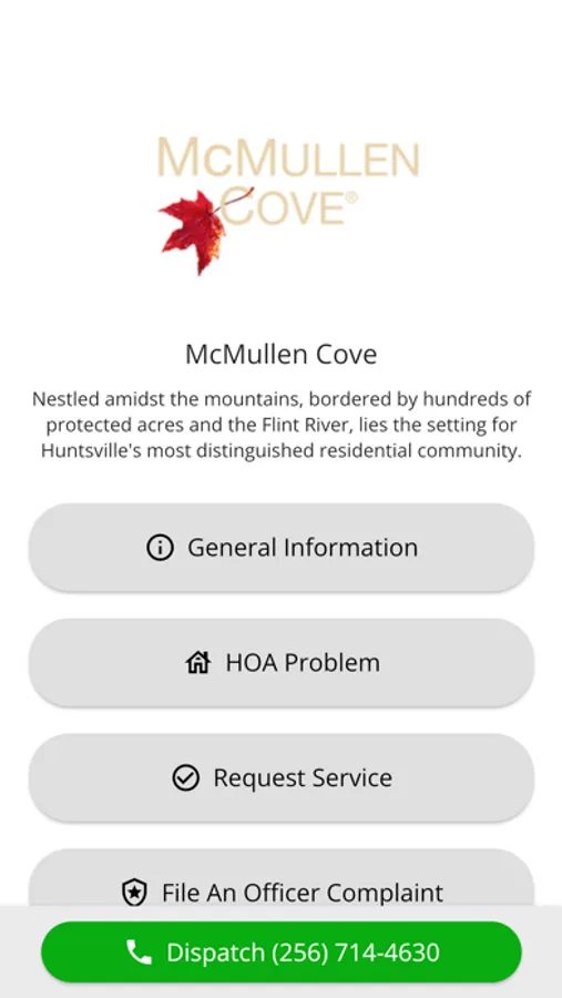 The Riley Security McMullen Cove application is for all residents and visitors of the McMullen Cove area and community to use. You can get general community information, events calendar, request security patrol services, file complaints and more. McMullen Cove - nestled amidst the mountains, bordered by hundreds of protected acres and the Flint River, lies the setting for Huntsville's most distinguished residential community.