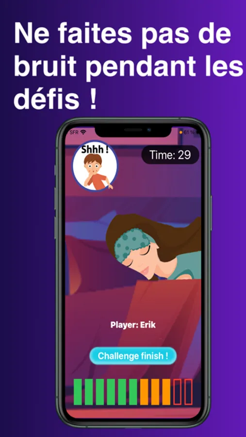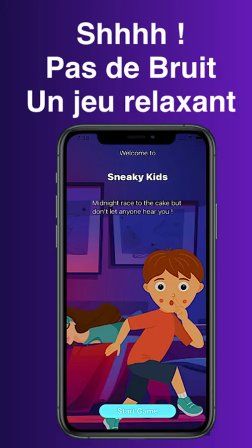 Shhh Pas de Bruit ! est un petit jeu à jouer comme un jeu de société à plusieurs. Les joueurs prennent le rôle d'enfants sortant de leur chambre pour accéder à la cuisine, tout en essayant de ne pas réveiller les différents membre de la famille endormis sur le chemin. Les joueurs auront dans chaque pièce un défi les attend. Les défis sont faits à partir de simple objets du quotidien. Réaliser ses défis sans faire trop de bruit, votre microphone vérifiera le niveau de bruit.... Atteignez la cuisine et Gagner le Jeu !