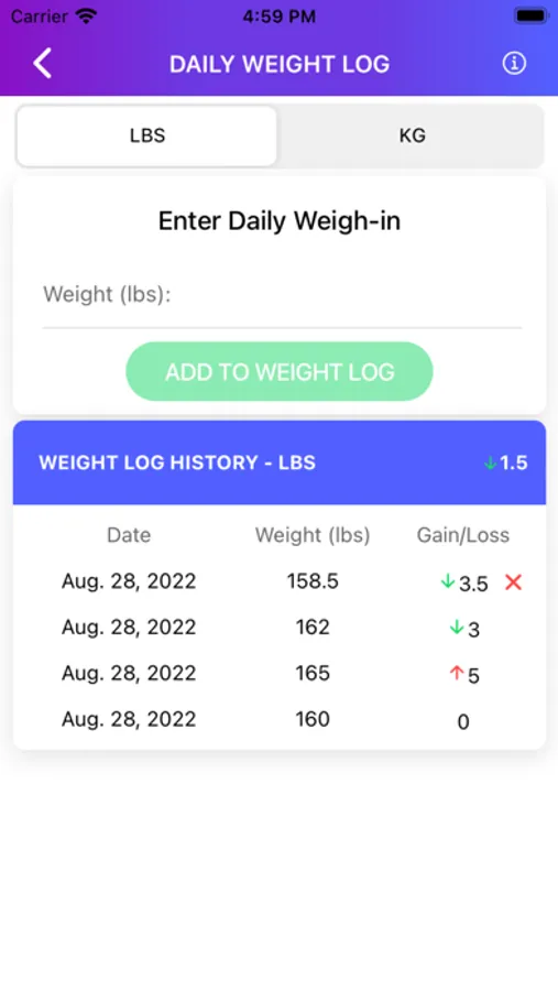 This page can be used to log your weight each day to monitor overall and per diem weight loss progress over time.