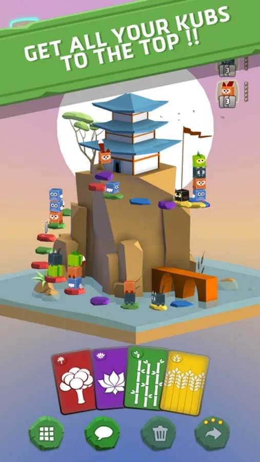 The objective of the game is to get your 5 cute little animal cubes (Kubs) to the top of the mountain before the other players. The stairs to the top consists of 25 steps and each step has 1 of 5 different colours. You can move a Kub to the next or previous step of a certain colour by playing a card of that colour. When arriving at a step where there’s already another Kub, you can jump on top of it or below it, thus making a stack. When moving the bottom Kub of a stack, you move all the other stacked Kubs with it. There can only be 4 Kubs in a stack, so when another Kub is added to the stack, the top one falls off.