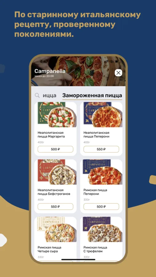 Мы готовим премиальную ремесленную пиццу по старинным итальянским рецептам. Вы можете выбрать пиццу из печи или замороженную, которую можно самостоятельно доготовить у себя дома.