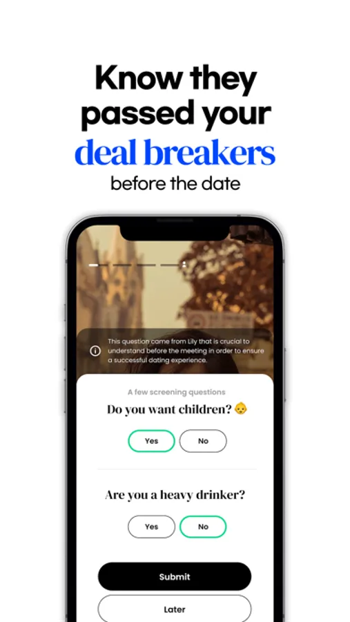 With Skip, you have control of who you go on a date with, not an algorithm. We’ve added the ability for women to set any custom dealbreaker screening questions that matter to her. Don’t want to bother with a cat person? Credit score below 650 just won’t do? Not ready for something serious yet? Toss those matches out of the way from the start with the custom Deal Breaker Screeners. Let’s do away with that awkward conversation of figuring out if your date is looking for the same thing as you or not.