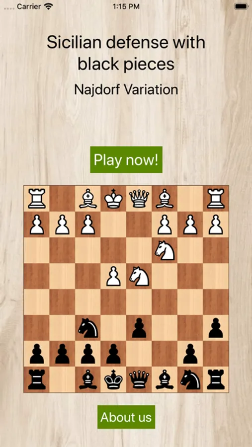 The tasks are divided into 3 groups according to the main lines of such a popular opening as the Najdorf variation of the Sicilian defense. In all games of this application, the victory was achieved by the chess players who played with black pieces.