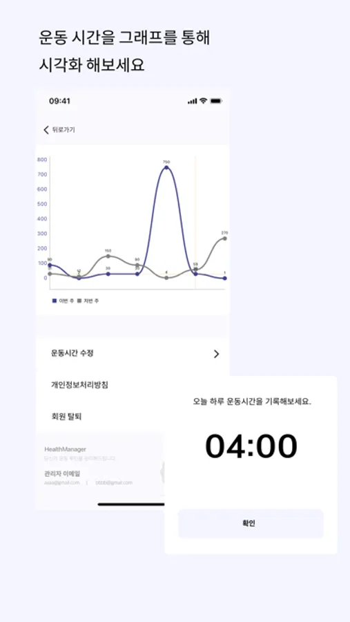 오늘 하루 운동시간을 기록해 그래프를 통해 분석된 데이터를 시각화하고, 나에게 필요한 시간에 필요한 문구로 알람을 보내보세요!