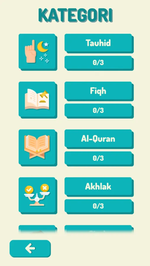 1- Terdapat 5 kategori soalan iaitu Tauhid, Al-Quran, Fiqh, Sirah Nabawiyyah dan Akhlak