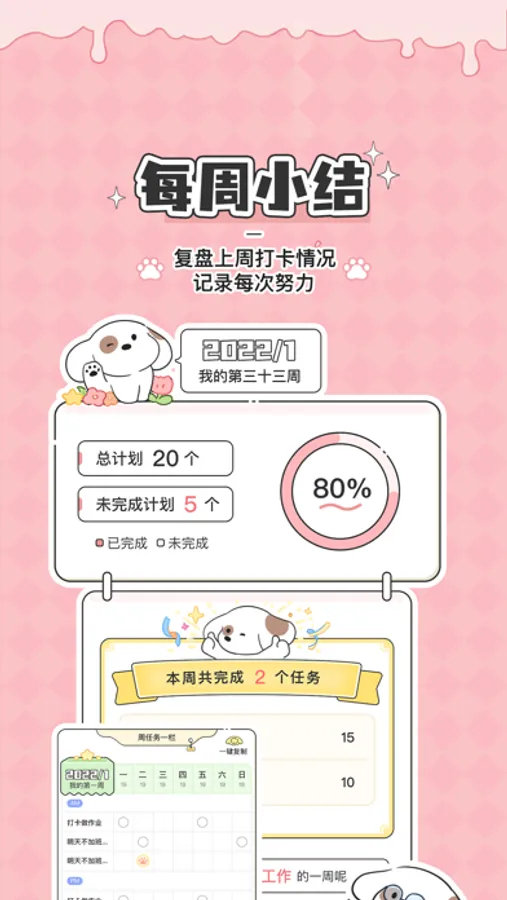 制定专属计划打卡清单,规划每周需要打卡次数,按时完成设定目标,培养高效的时间管理,让自律成为你的习惯。