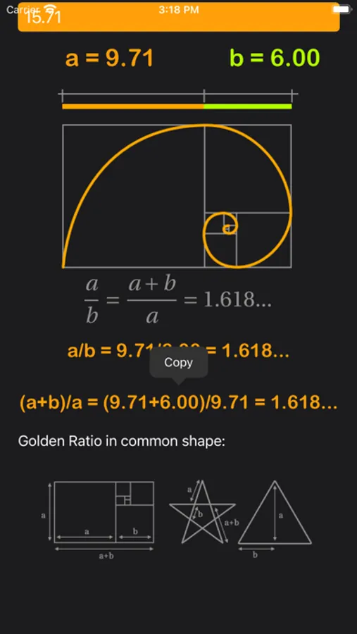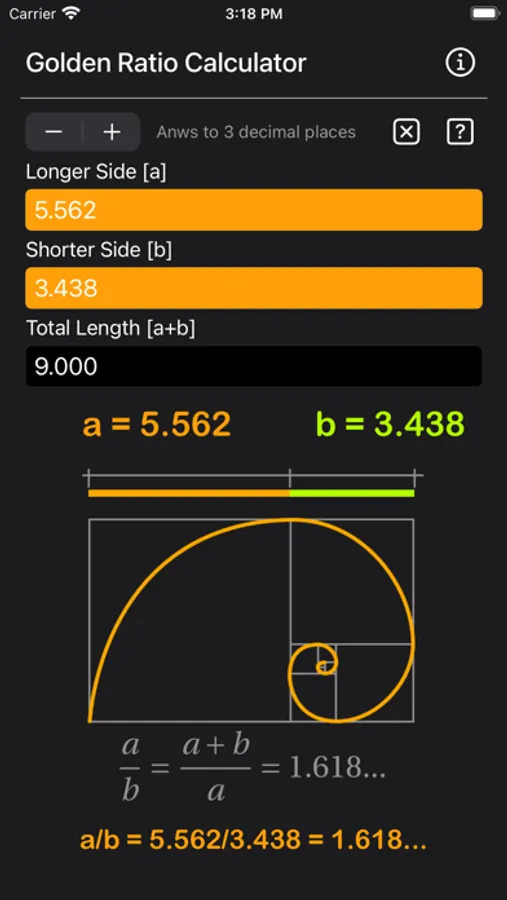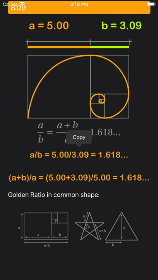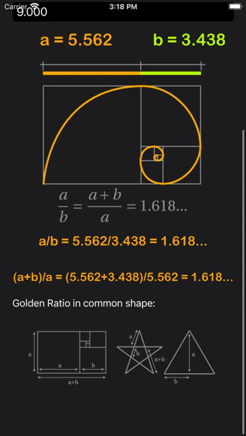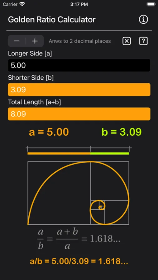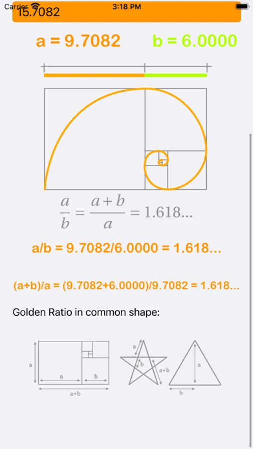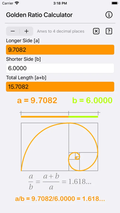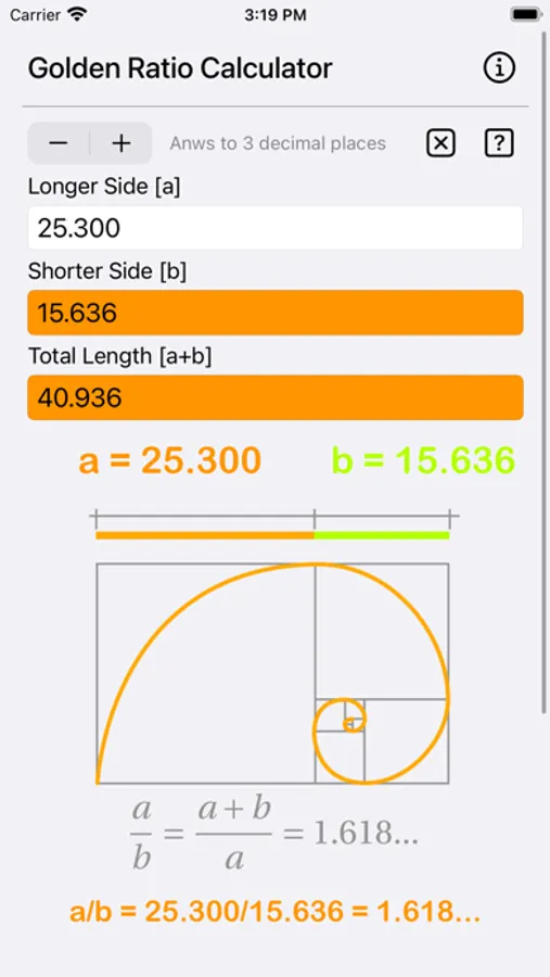 The Golden Ratio Calculator is a physic/math calculator to calculate the longest side [a], shorter side[b] or combined length of the two sides [a+b] to compute the golden ratio.