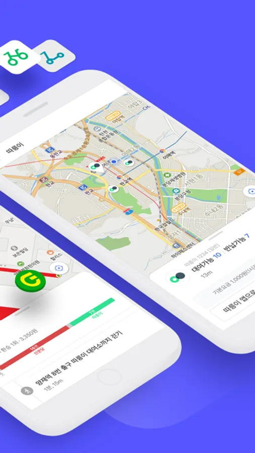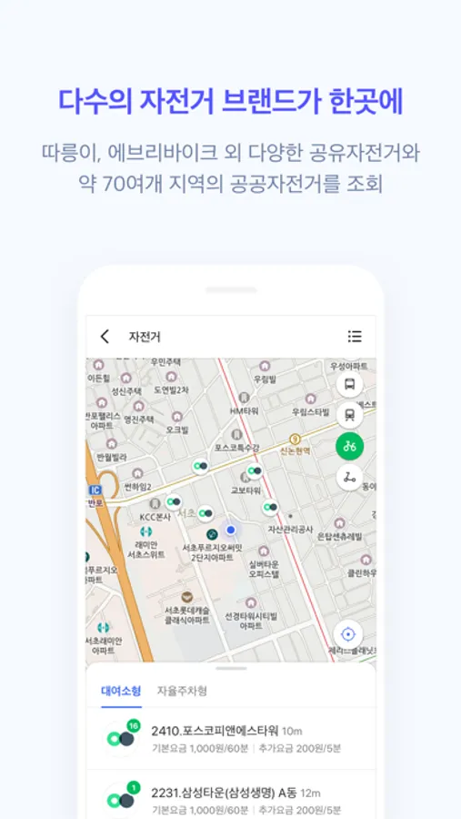 - 따릉이, 에브리바이크 외 다양한 공유자전거와 약 70여개 지역의 공공자전거를 제공합니다.