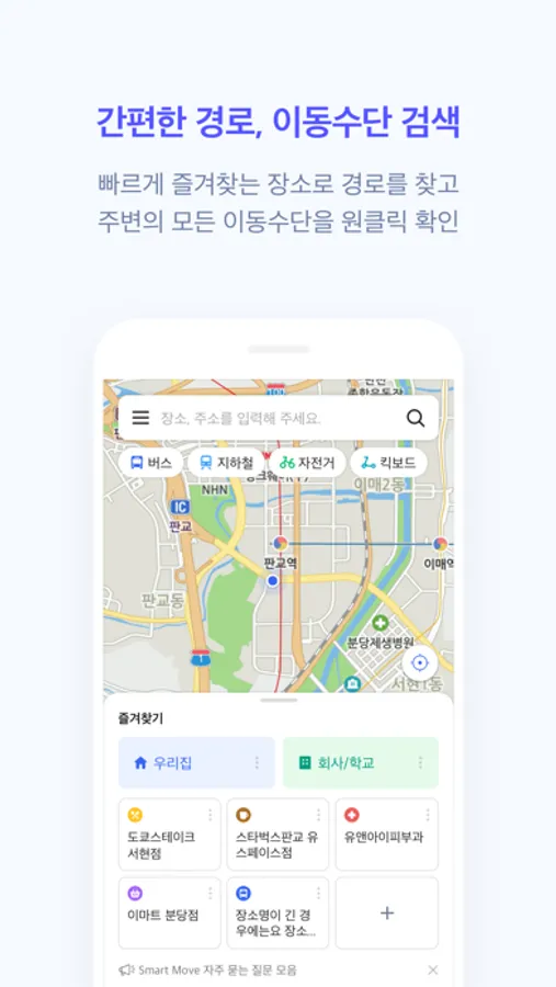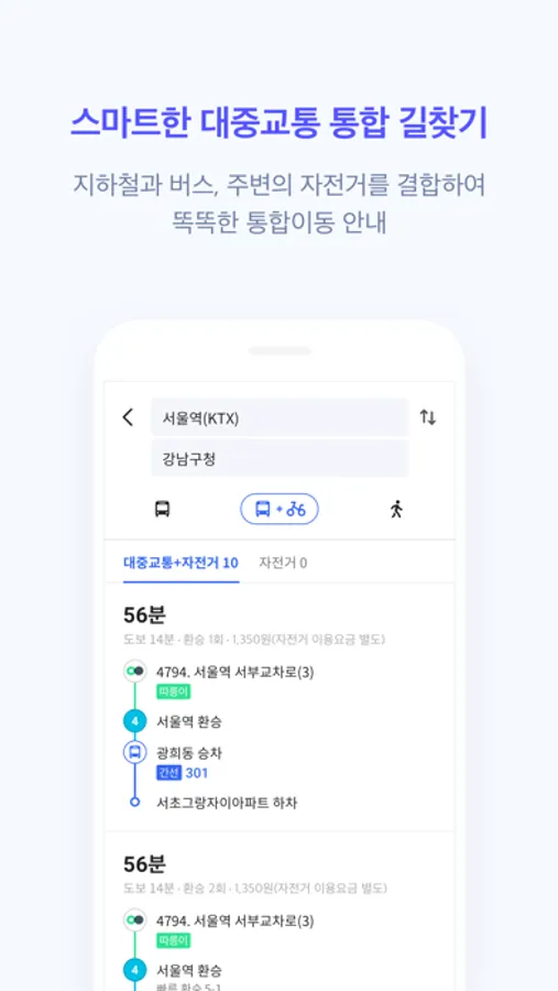 - 지하철과 버스, 주변의 자전거를 결합하여 똑똑한 길찾기를 제공합니다.