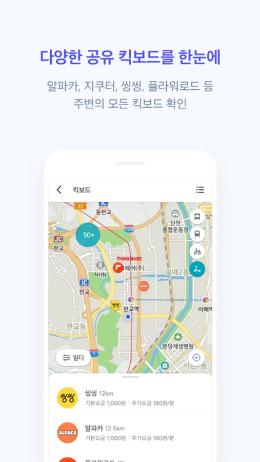 - 알파카, 지쿠터, 씽씽, 플라워로드 등 주변의 모든 킥보드를 한눈에 제공합니다.