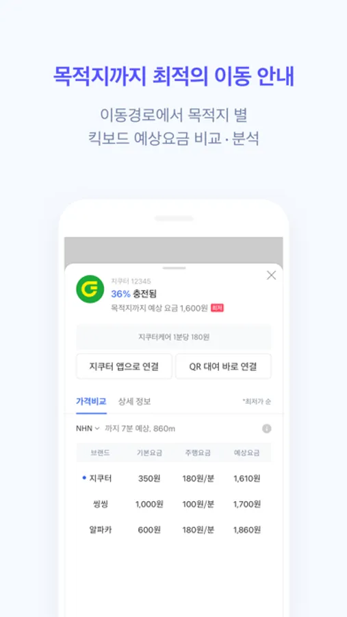- 킥보드 브랜드 별 예상요금 및 상세 이용정보를 확인할 수 있어요!
