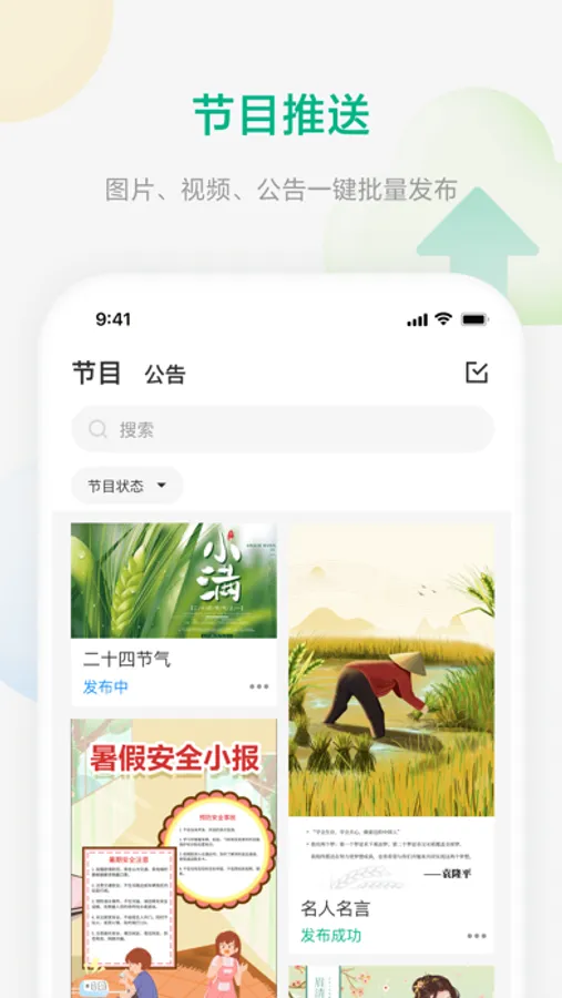 校园集控是一款轻量化的移动版信息发布系统,为校园用户提供更加便利的画屏绑定方式,快速地发布节目、公告,更加直观的远程管控设备