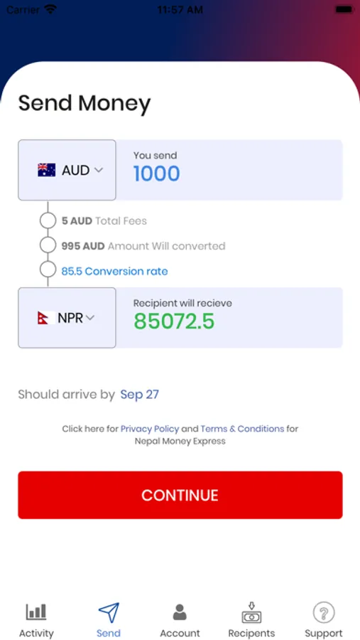 Add the amount you want to send and recipient’s details. Check the transaction fees upfront, and the estimated time your money will be delivered.