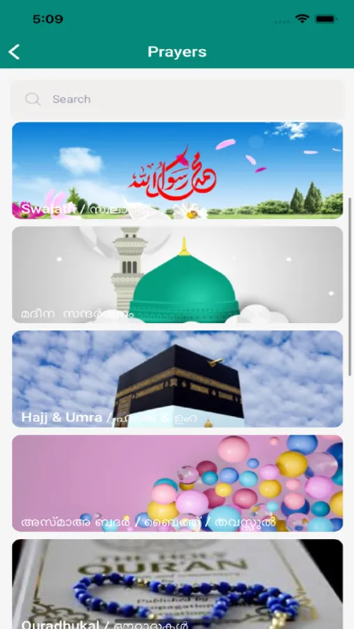 The ‘Spiritual’ segment focuses on Islamic day to day routines such as Quran, Quran Malayalam Translation, Quran recitation, Salah, Adhkar, Maulid, Aurad, Hajj & Umra, Fasting etc.