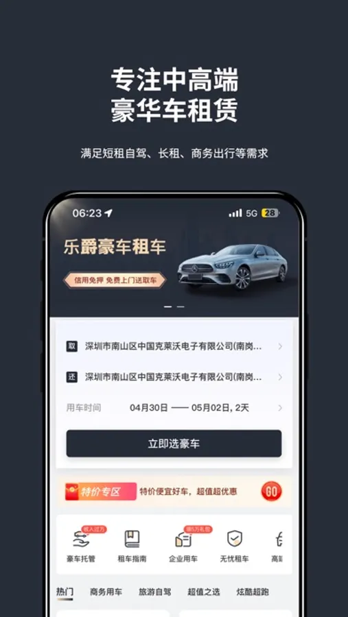 乐爵豪车租车是国内专注中高端汽车租赁服务的领导品牌,我们提供深圳租豪车、广州租车、惠州租车、中山租车、珠海租车、东莞租车、佛山租车等广东珠三角城市地区的免押金租车服务,为用户提供豪车租赁的出行体验。我们的应用程序提供多种车型,包括劳斯莱斯、奔驰、宝马、奥迪、保时捷、法拉利、宾利、路虎、兰博基尼、特斯拉、埃尔法、野马等主要品牌,满足短租自驾、长租、企业用车、商务出行、自驾旅游、限行代步等多种用车需求。