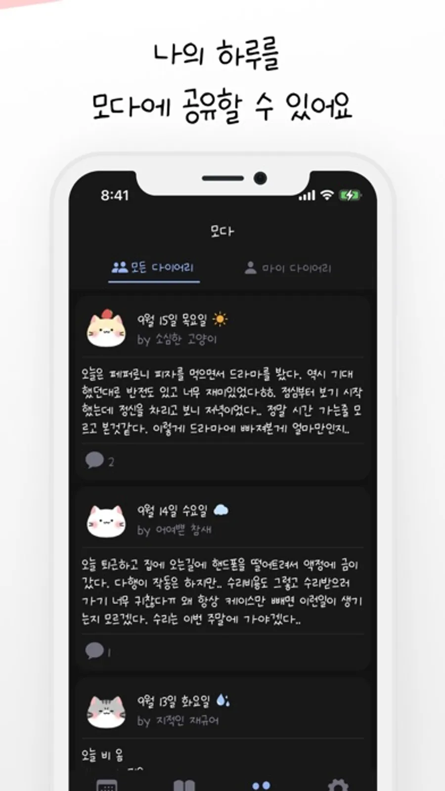 - 나만 볼 수 있는 개인 일기와 모두 볼 수 있는 모다 일기 두 가지가 있어요.