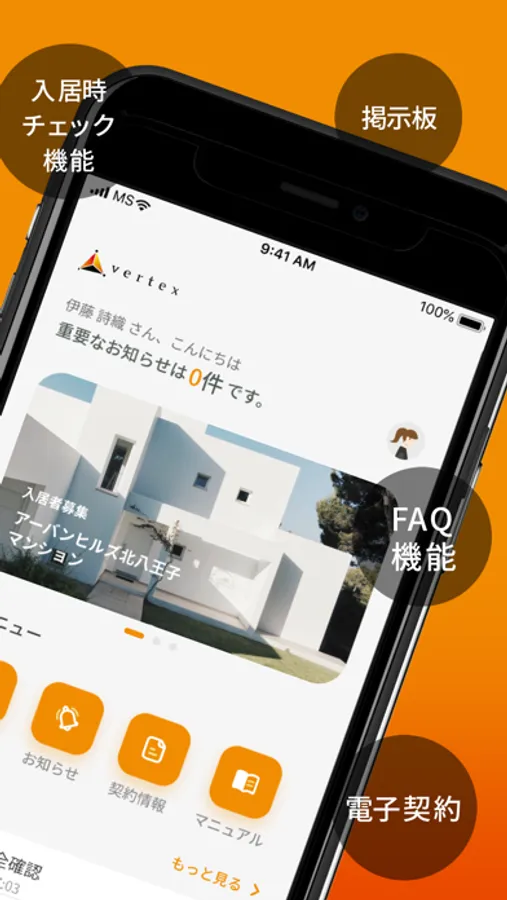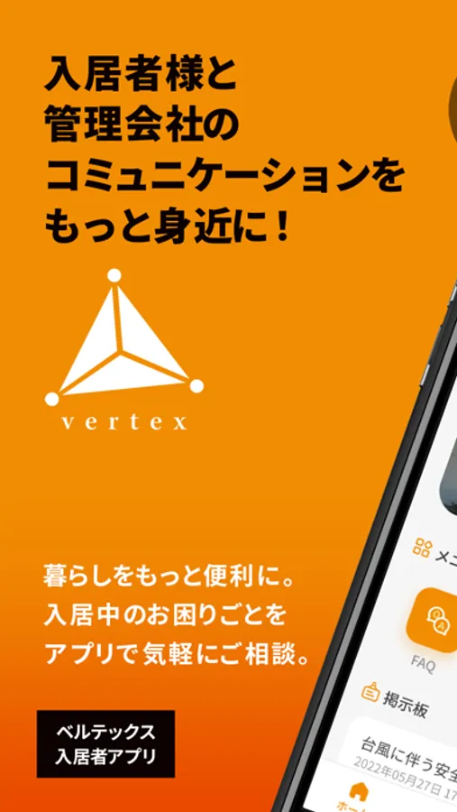 ベルテックス入居者アプリは、入居者様と当社とのコミュニケーションを円滑に行えるスマートフォン用アプリです。
