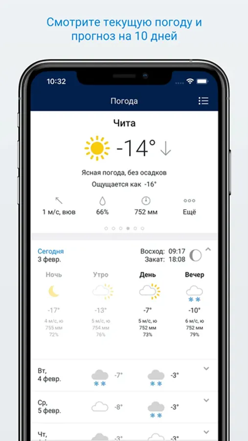 - узнавать прогноз погоды на ближайшие 10 дней;