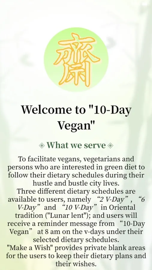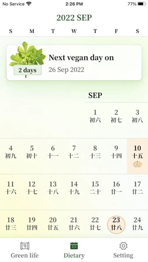 Alarm for Oriental dietary based on Lunar calendar, including 2 V-Day,6 V-Day and 10 V-Day schedules.