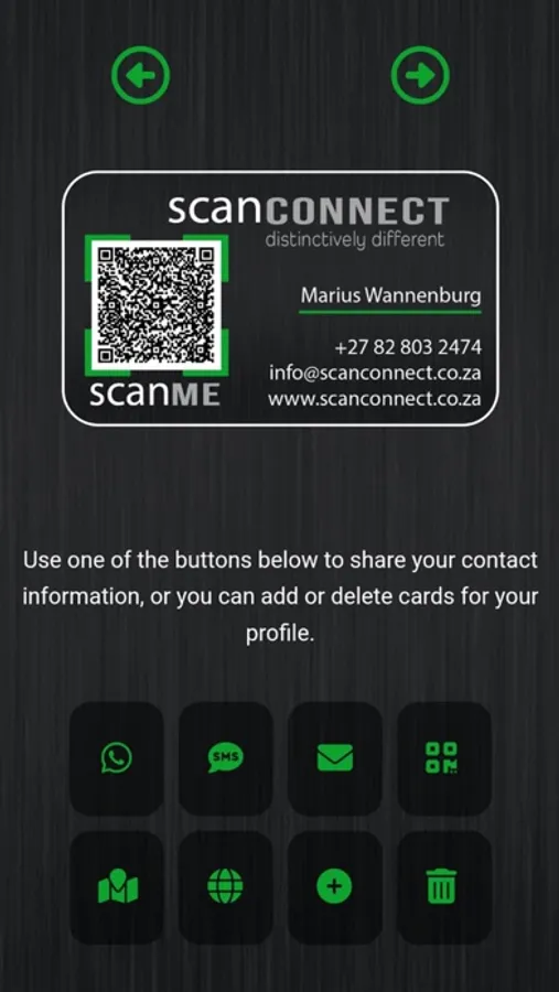 Once scanned, the info would be available on a scanCONNECT APP and so have the ability to share your unique QR code, share your business address with mapping, they can call you, email you, chat on WhatsApp, have business or individuals to CONNECT with your website, e-commerce platform or to save info for later.