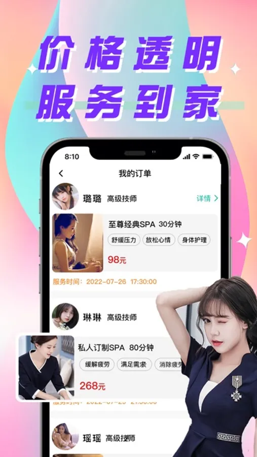 感谢您选择我们的高品质上门按摩服务,我们一直专注于高质量的用户服务和用户体验,让您随时随地都能预约到心仪的技师上门服务,帮助您按摩舒缓身体的疲劳每天都有好心情。