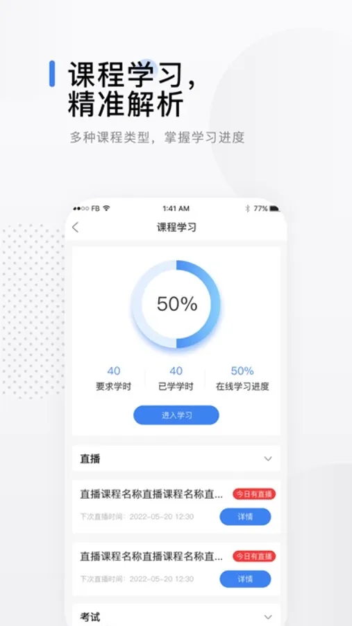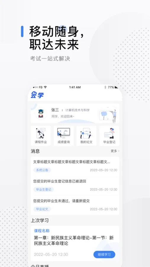 云学课堂是为继续教育的学员在线学习的平台,主要包含在线学习视频课程、做题、考试等功能,学员可通过APP查看自己的考试成绩、学习情况等信息,并可以实现线上论文评测与毕业登记表提交等功能,实现所有线下流程线上化,帮助高校实现学员线上管理。