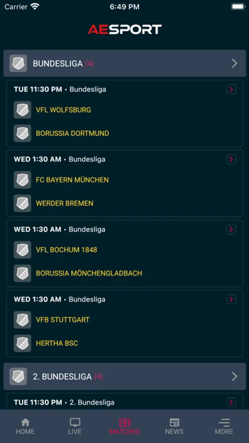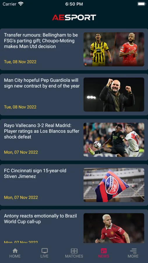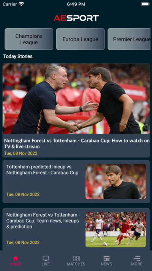 AESport app, Coverage all the competitions around the world including: all International Football, UEFA Champions League, Premier League, Serie A, Bundesliga, Ligue 1, UEFA Europa League, English Football League, Carabao Cup, Copa Del Rey, Community Shield, International Champions Cup, European Championship 2023 and other major Football tournaments across the world.