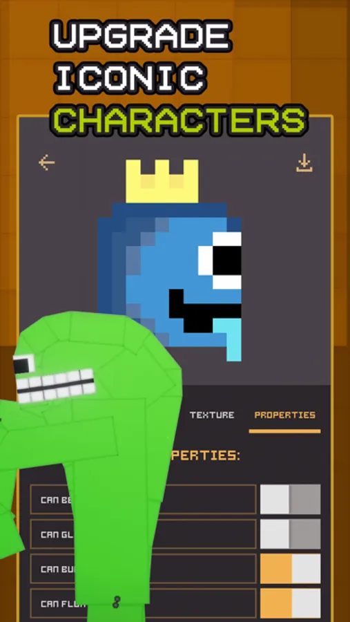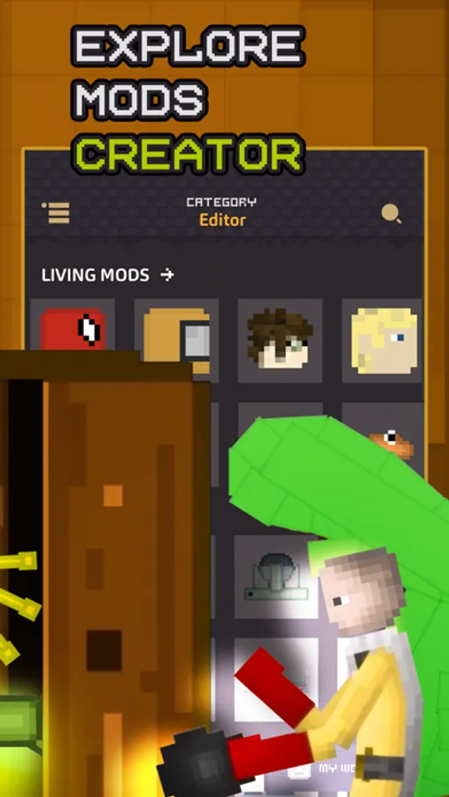 New upgrade: Creator Mod in your pocket! Now you can edit elements in our functional creator. Preparation of this took a little time, but now creator can be used conveniently and simply. Now you can change your favorite characters in the editor, resize elements such as head, legs or entire objects. You can give them your own unique properties, sizes and make them huge or very small.