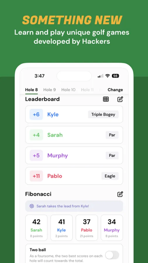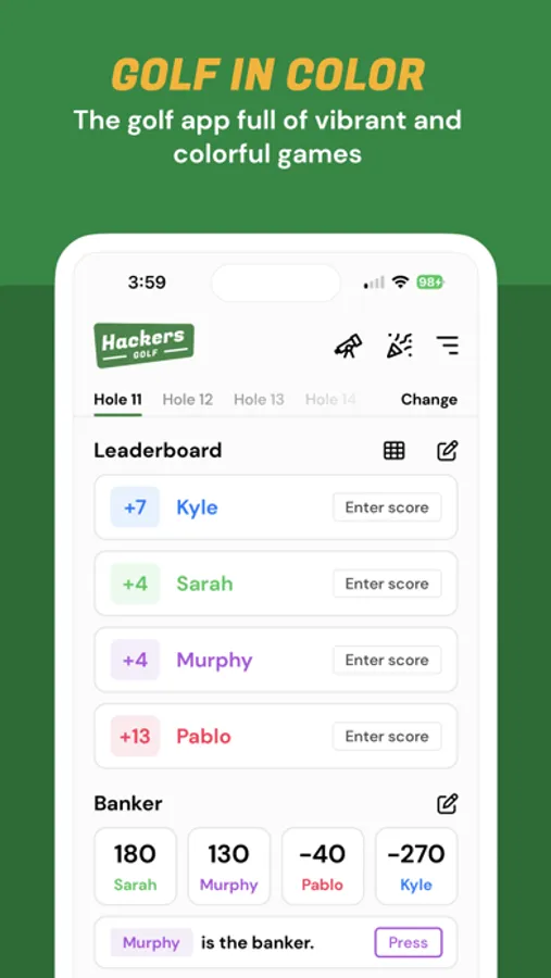 Welcome to Hackers - the colorful golf app full of exciting games and formats that you and your party can play during your next round of golf! We understand that golf is hard, and sometimes you'll find yourself short on fun when you're playing - you're a hack! This app was build to serve all golf enthusiasts, no matter how good you are or how long you've been playing. Our main mission is for you to experience the joys of the game of golf while also showing you fun scenarios and formats for how creative you can get with the game.