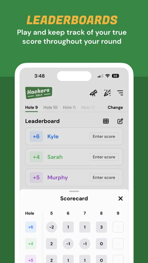 * LEADERBOARD - Aside from side games, you enter all stroke scores on the Leaderboard. It will keep your true score throughout your round (both gross and net if using handicaps).