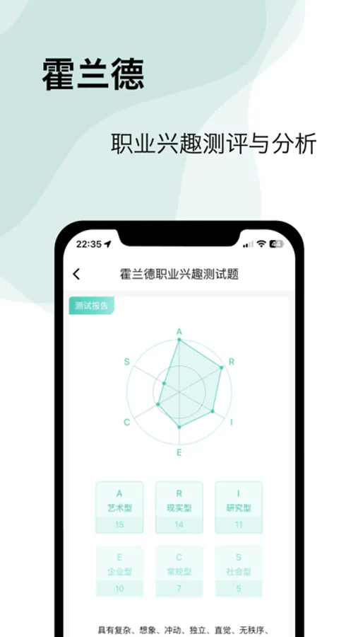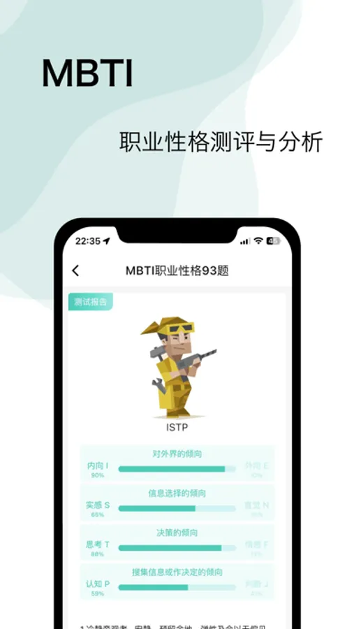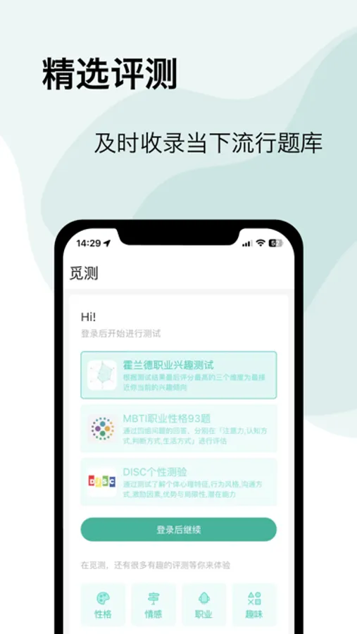 MBTI职业性格测试,菲尔人格测试,沟通能力测评,事业心测评,DISC个性测验,等多种个性性格测试,并且提供了详细的性格解析报告