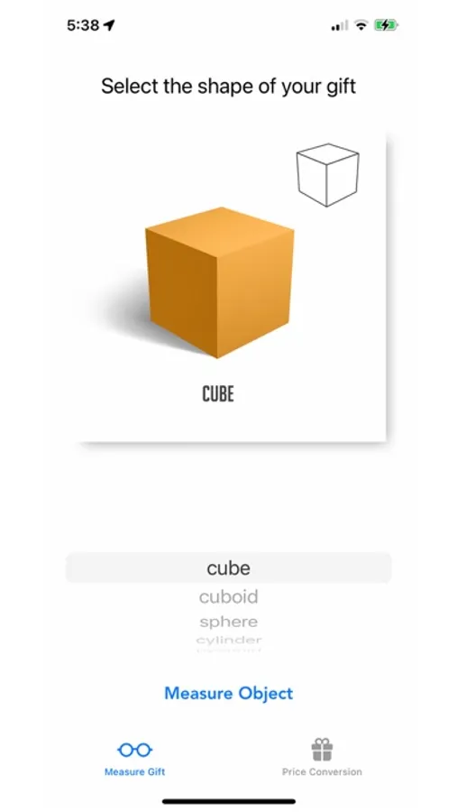 Augmented Reality measures large objects and returns length of wrapping paper needed for a selected geometric shape's lateral surface area.
