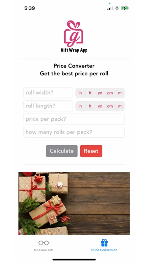 Gift Wrap App converts pricing and units of measurement to get the best price when purchasing wrapping paper.