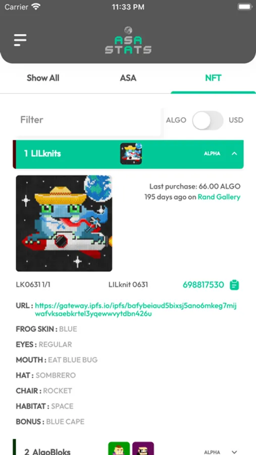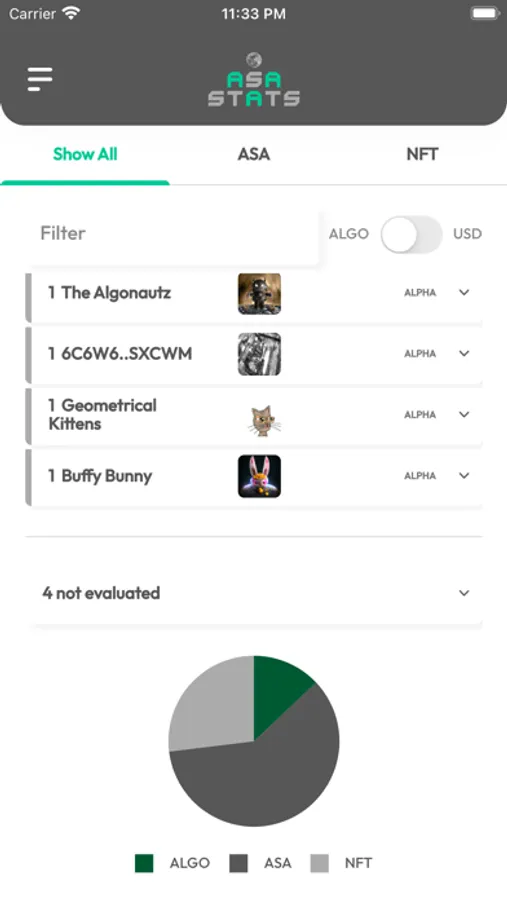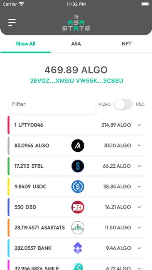 ASA Stats Mobile is a mobile app that uses ASA Stats API to evaluate and present the current balance for any wallet address on the Algorand blockchain.