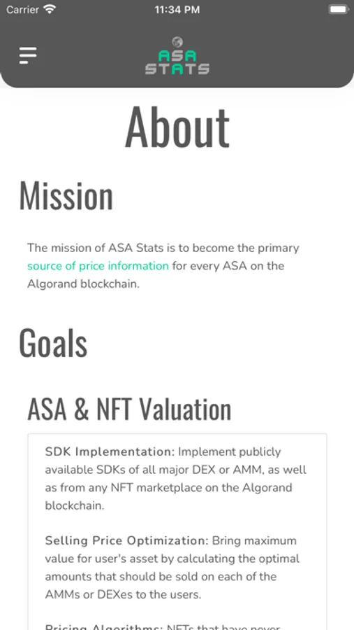The mission of ASA Stats is to become the primary source of price information for every ASA on the Algorand blockchain for traders and software companies. ASA Stats will continue to provide free services for average, non-professional use.
