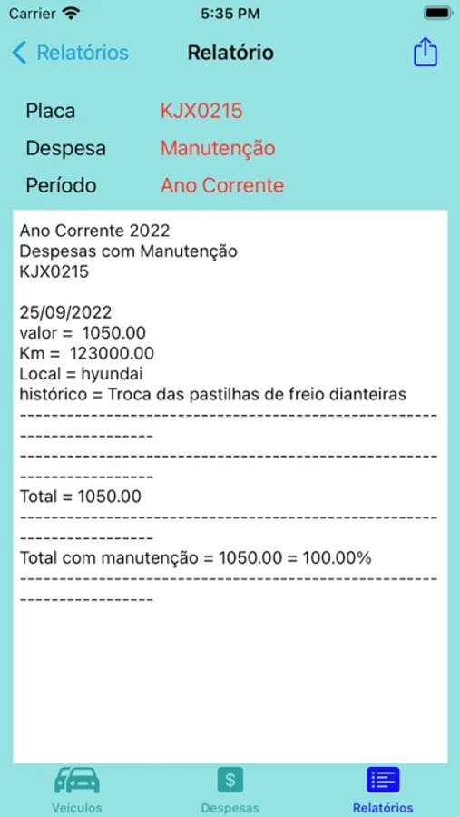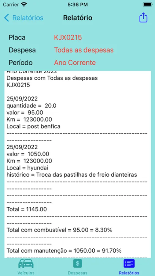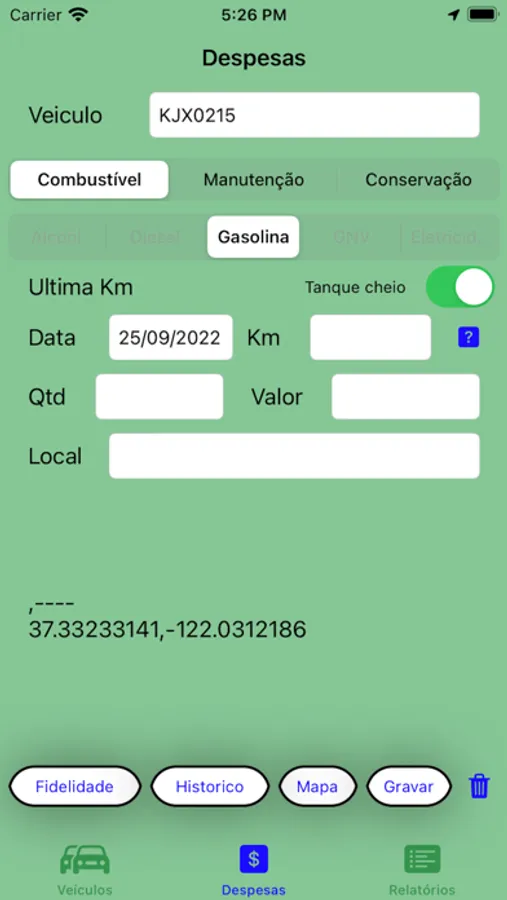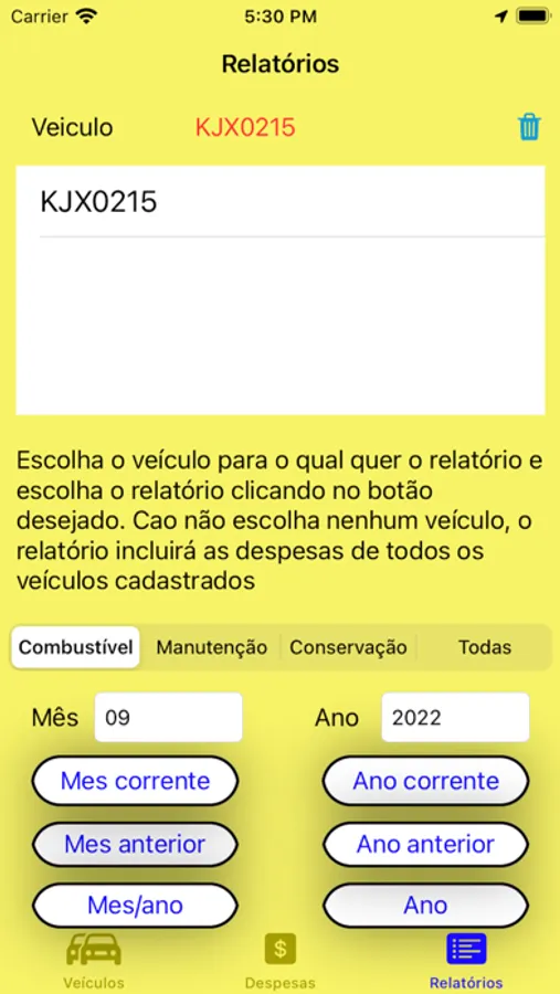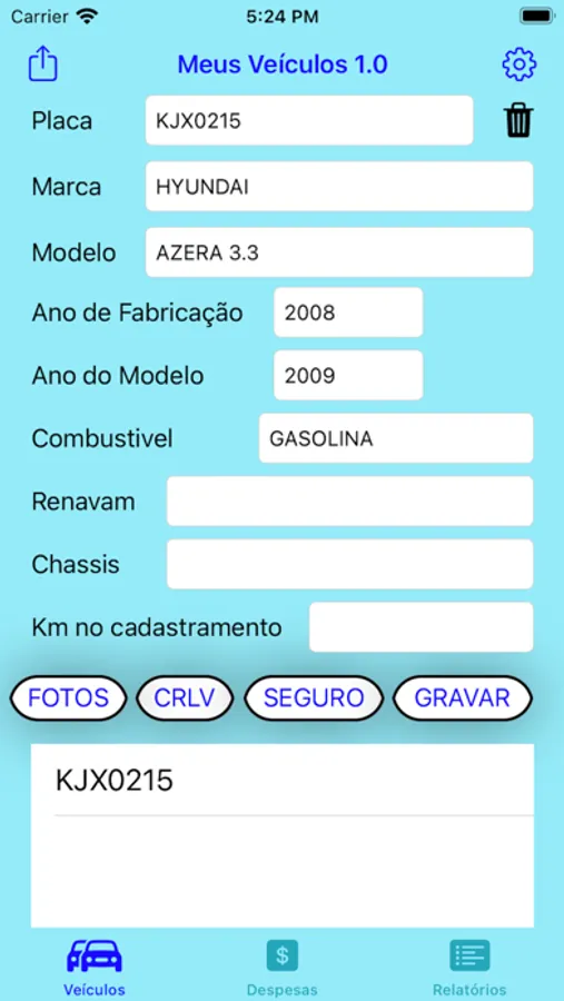 Este aplicativo é destinado para o controle do seu veiculo ou da frota de veículos. cadastre seus veículos com todos os dados pertinentes, dados do seguro , CRLV, programas de fidelidade, cartões de estacionamento e todas as despesas com combustíveis, manutenção e conservação, com a km , calculando o consumo médio de combustível,permitindo gravar a localização de onde ocorreu a despesa, fazer uma descrição de despesa e até salvar uma foto na nota fiscal. Emite relatórios por tipo de despesa ou todas elas, de um veiculo ou de toda a frota, em um determinado mês/ano, mas ou ano, percentual de cada tipo de despesa. Pague somente uma vez para utilizar o app indefinidamente. Não há mais cobranças de nenhuma espécie. Pode ser utilizado pela pessoa física ou empresa sem custo adicional.