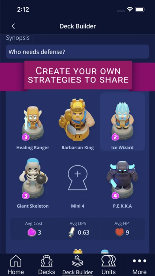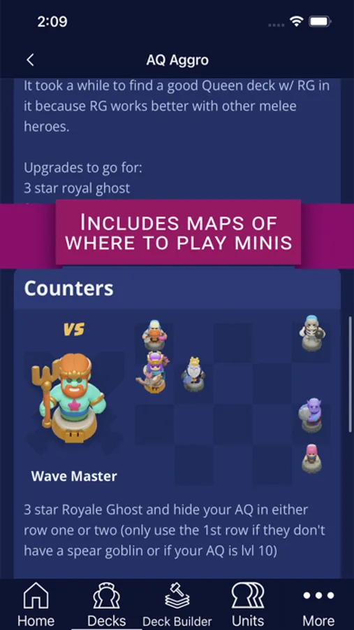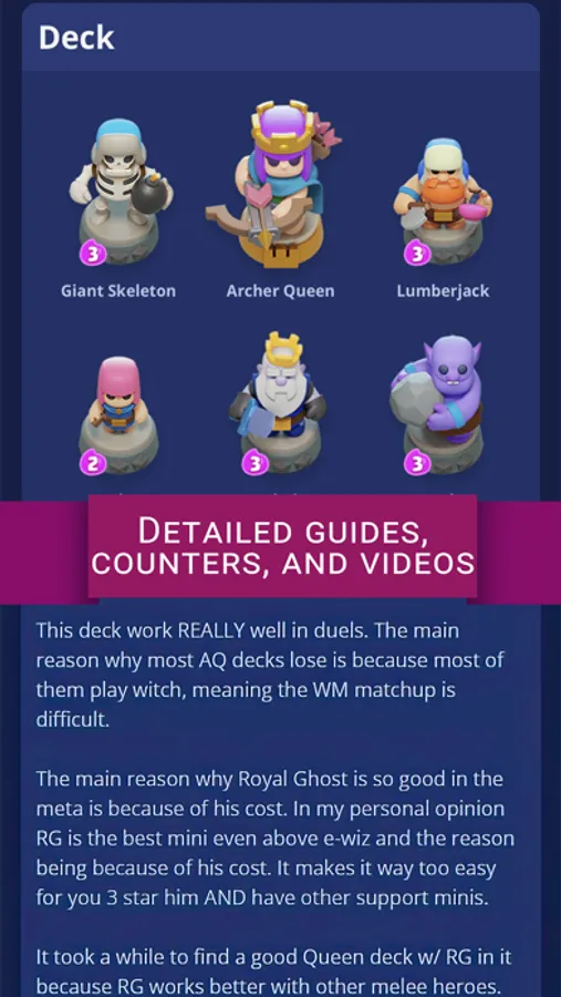 Decks for Clash Mini features hundreds of user submitted builds covering all of the heroes offered in the game. You’ll find a deck no matter the play style you prefer. The most popular decks even include counters and videos, in addition to detailed write ups. Start your journey to the legendary tier today with Decks for Clash Mini!